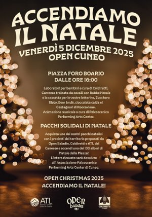 Venerdì 5 dicembre appuntamento con "Accendiamo il Natale" nella città di Cuneo, presso piazza Foro Boario. Dalle ore 16.00, laboratori per bambini, carrozza con Babbo Natale, zucchero filato, Beer brûlè, cioccolata calda, castagnari di Roccavione (fino all'8 dicembre) e, fino al 24 dicembre, possibilità di imbucare la letterina nella cassetta situata presso l'Ufficio Turistico di Cuneo (via Carlo Pascal, 7). Infine, durante la serata, animazione musicale a cura di Palcoscenico Performing Arts Center.