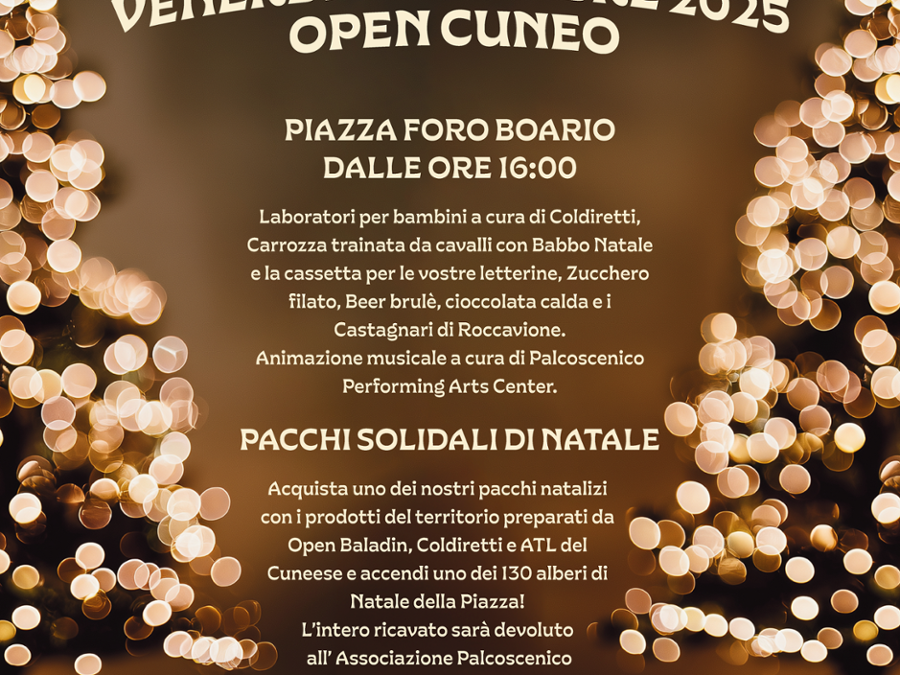 Acquistando uno dei pacchi natalizi con i prodotti del territorio preparati da Open Baladin, Coldiretti e ATL del Cuneese, potrai accendere uno dei 130 alberi di Natale della Piazza! L’intero ricavato sarà devoluto all’ Associazione Palcoscenico Performing Arts Center di Cuneo.