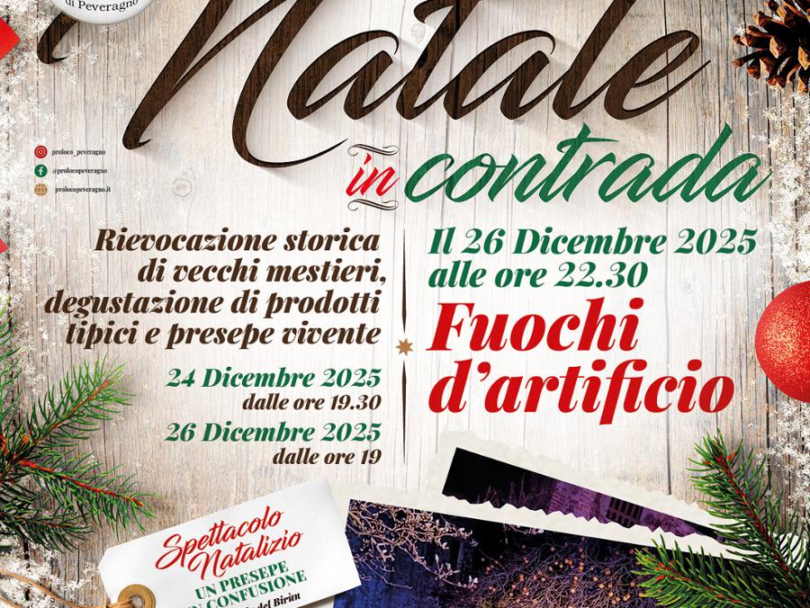 Torna a Peveragno il magico periodo del Natale con "Natale in Contrada". Appuntamento aperto a tutti il 24 dicembre dalle ore 19.30 e il 26 dicembre dalle ore 19. Tornano la tradizionale rievocazione storica dei vecchi mestieri, il presepe vivente per le vie del paese e degustazione di prodotti tipici. Le serate saranno accompagnate dallo spettacolo teatrale della Compagnia del Birùn. Inoltre il 26 dicembre il cielo si illuminerà con fuochi pirotecnici.