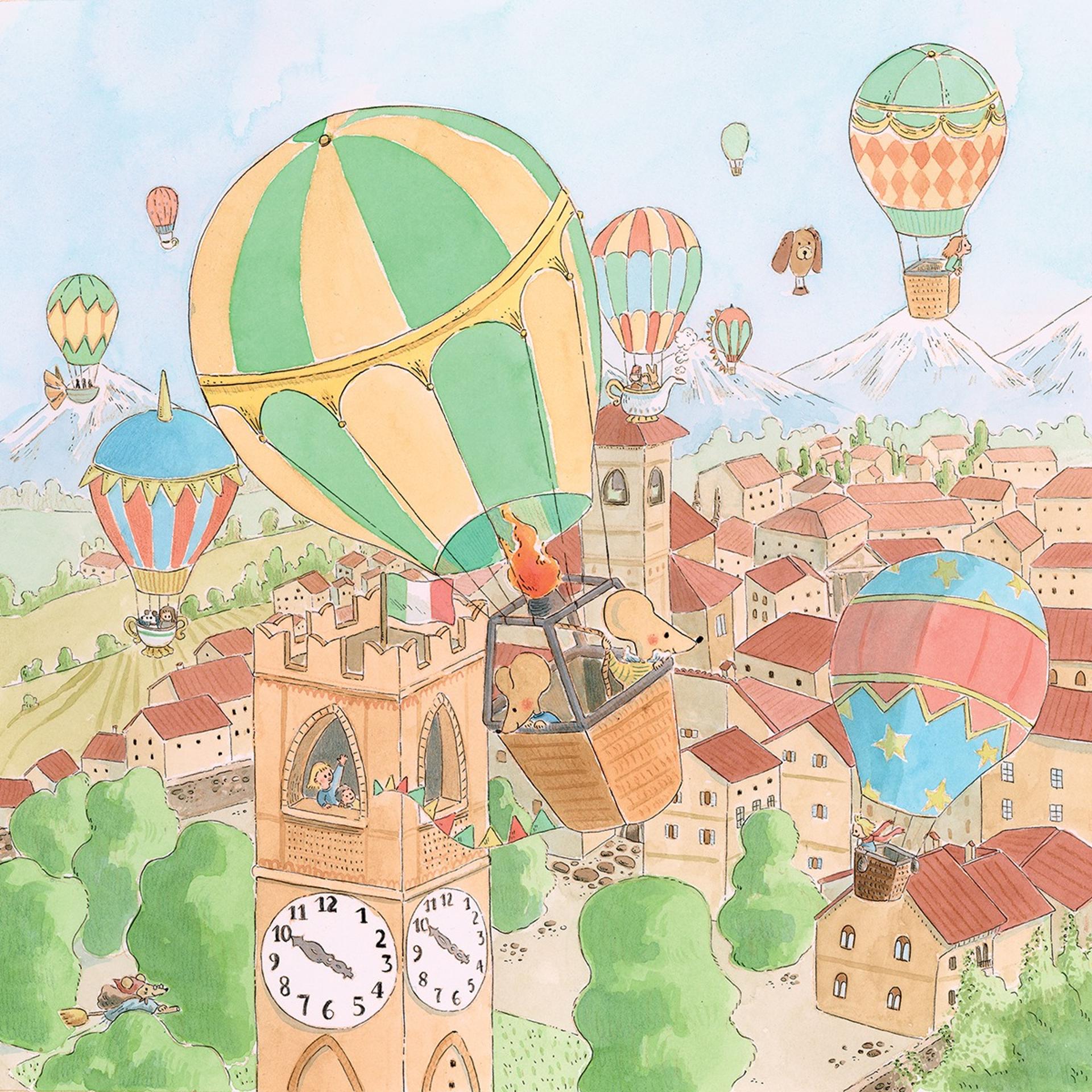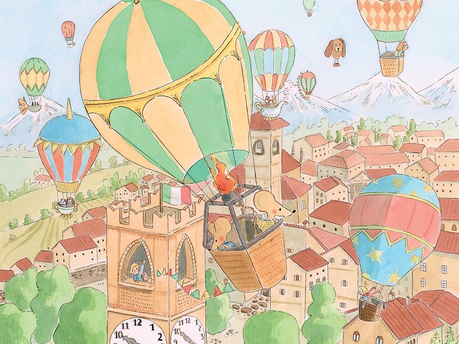 Le Meraviglie - l’illustrazione 2026. La locandina di RAIE26 è opera dell’illustratrice Alice Marinelli, tra buffi animaletti e strane teiere (con a bordo personaggi… non casuali!) che sorvolano la Torre medievale di Mondovì.